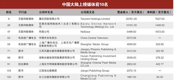 贏利能力最強的媒體公司是谷歌,利潤達194.78億美元;臉書(Facebook)利潤102.17億美元,排名第二;迪斯尼公司利潤為93.66億美元,排名第三。利潤前十強的媒體公司中,9家來自美國,另外一家是來自中國大陸的騰訊。